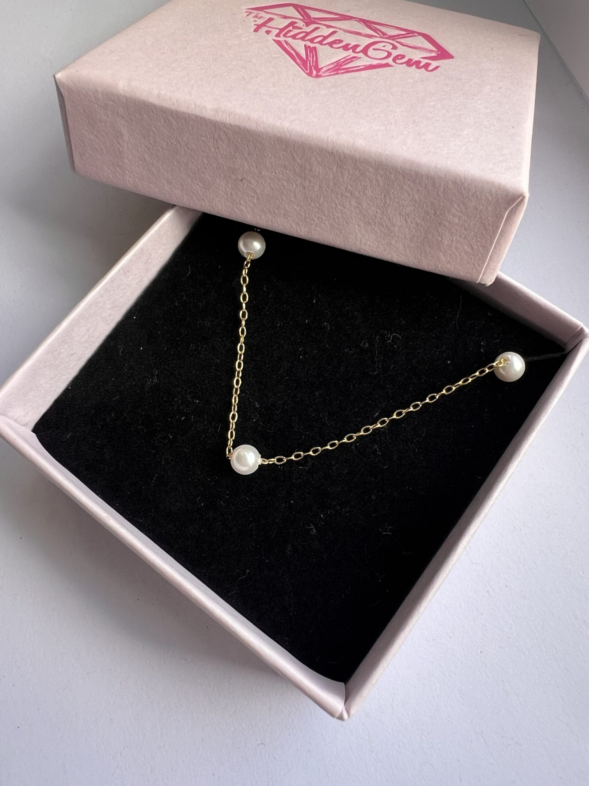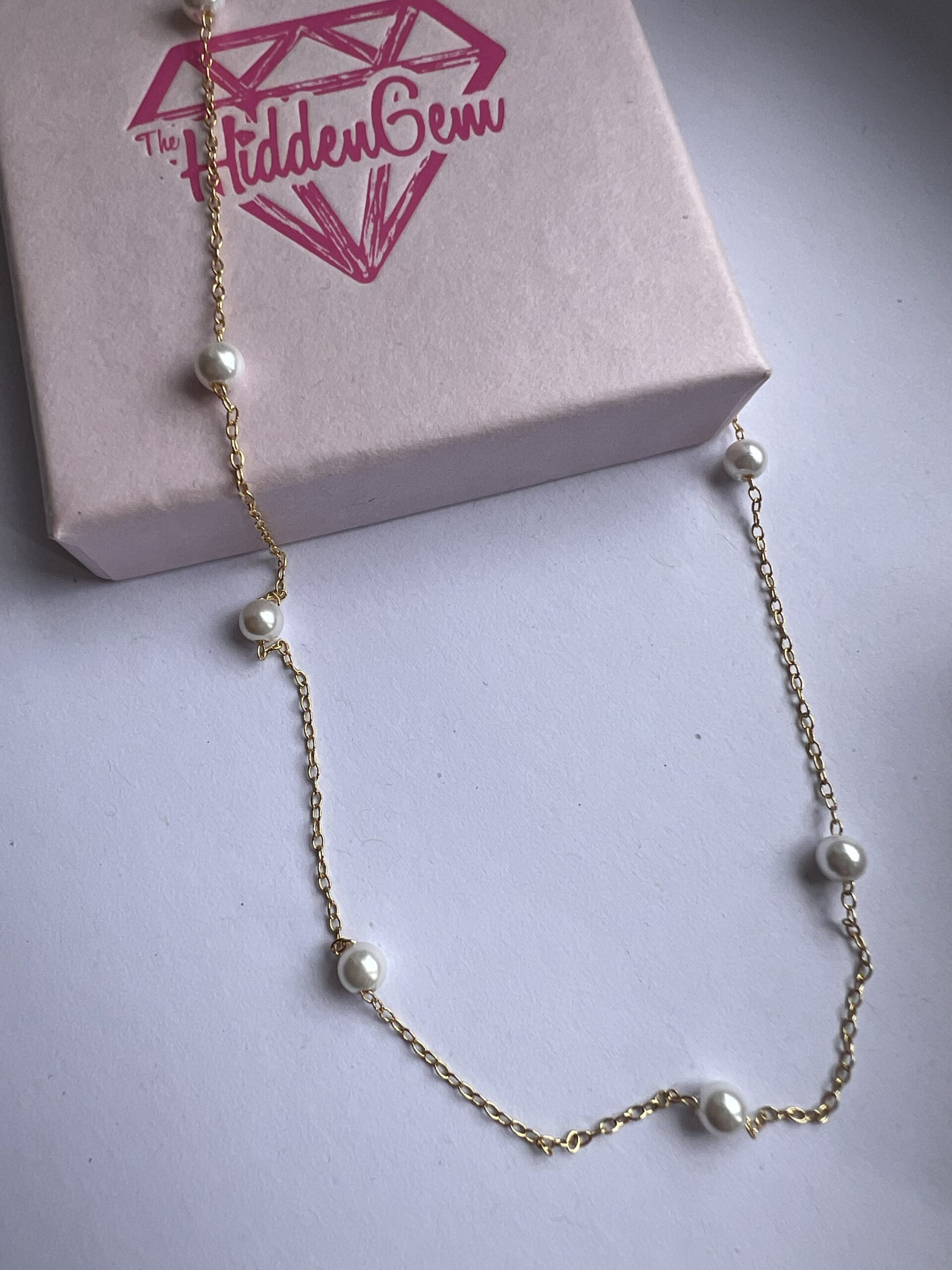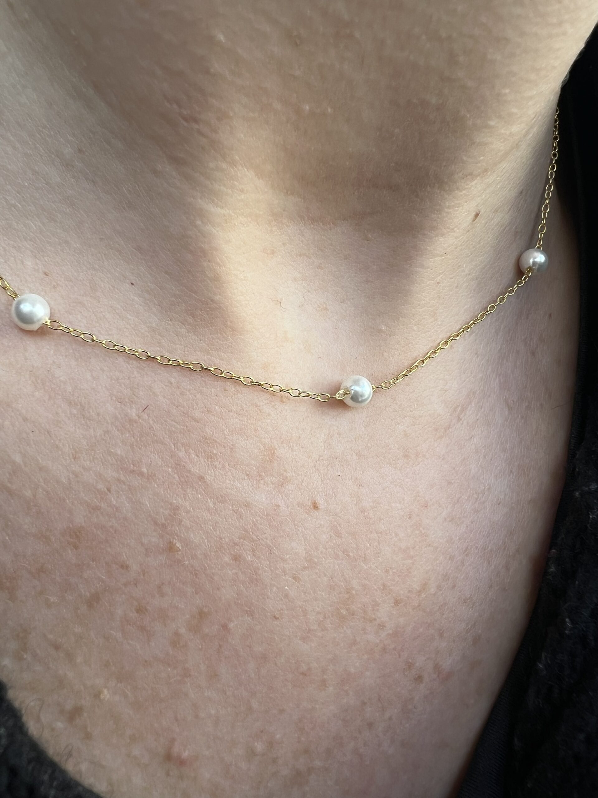 Elevate your everyday elegance with this timeless pearl stud necklace. Crafted from 100% 925 Sterling Silver and finished with a luxurious 18ct gold plate, this delicate piece features nine lustrous pearls spaced gracefully along a fine chain.