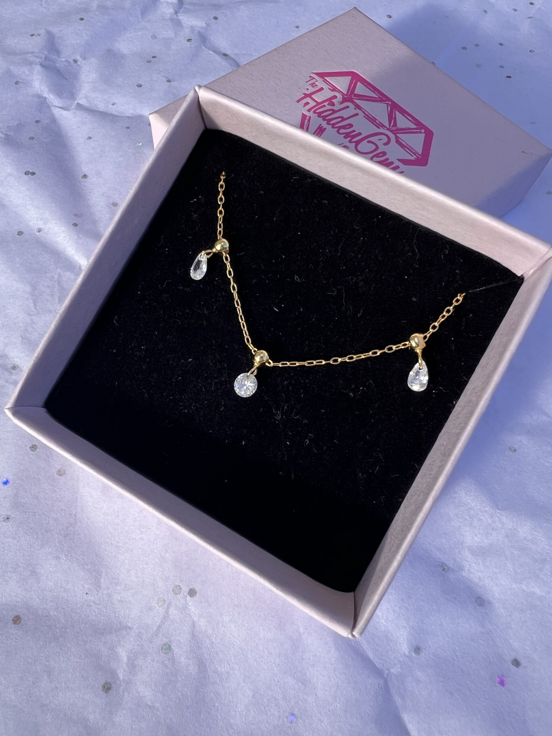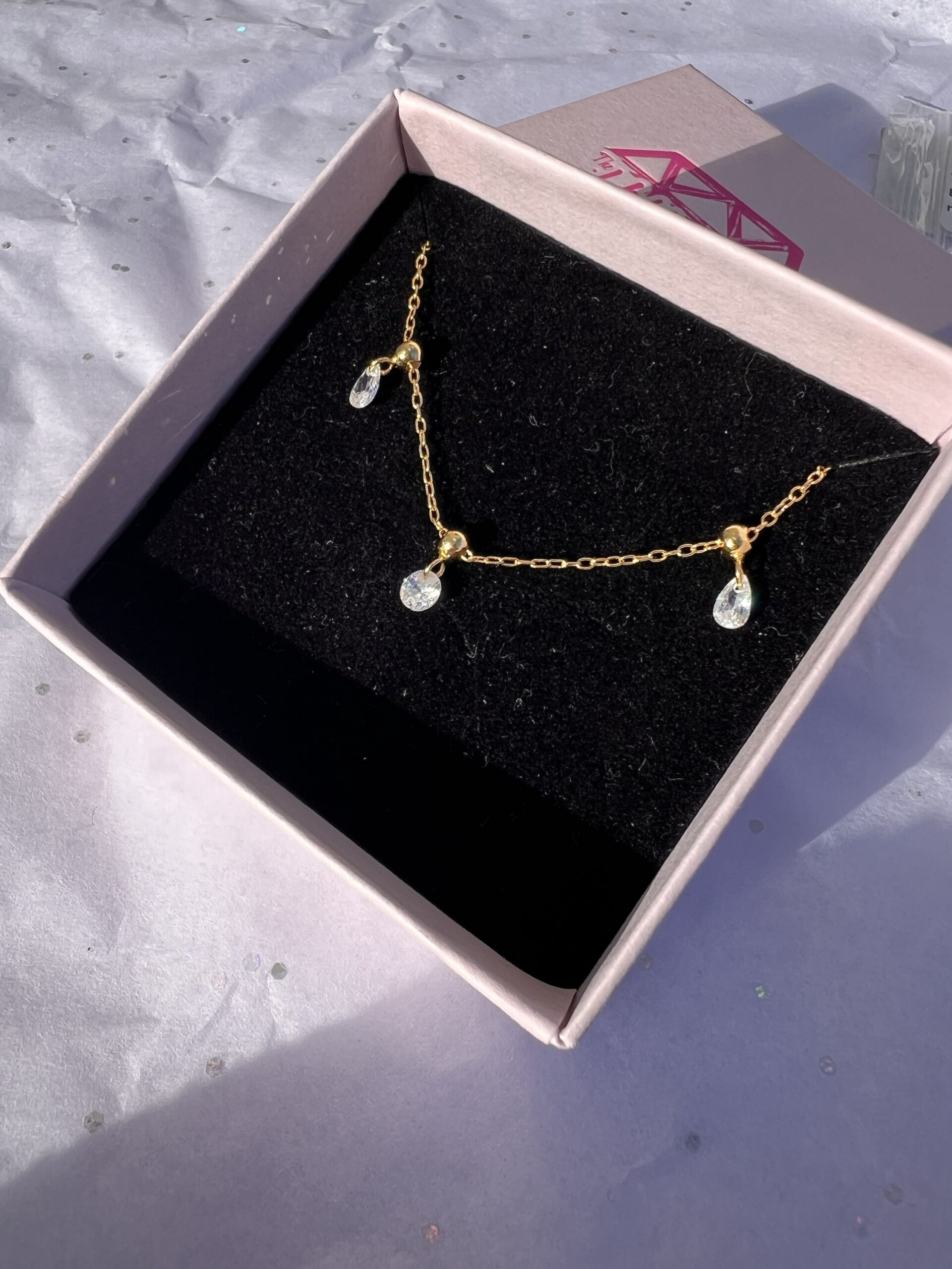 Elevate your everyday elegance with the Radiant Droplet Trio Necklace, a delicate piece crafted from 925 sterling silver and beautifully 18ct gold plated for a luxurious finish. Featuring three shimmering droplet-style cubic zirconia charms suspended along a fine gold-plated chain, this necklace catches the light with every movement. Perfect for layering or wearing as a standalone statement, it blends simplicity with refined sparkle—an ideal gift or personal treat for any jewellery lover.